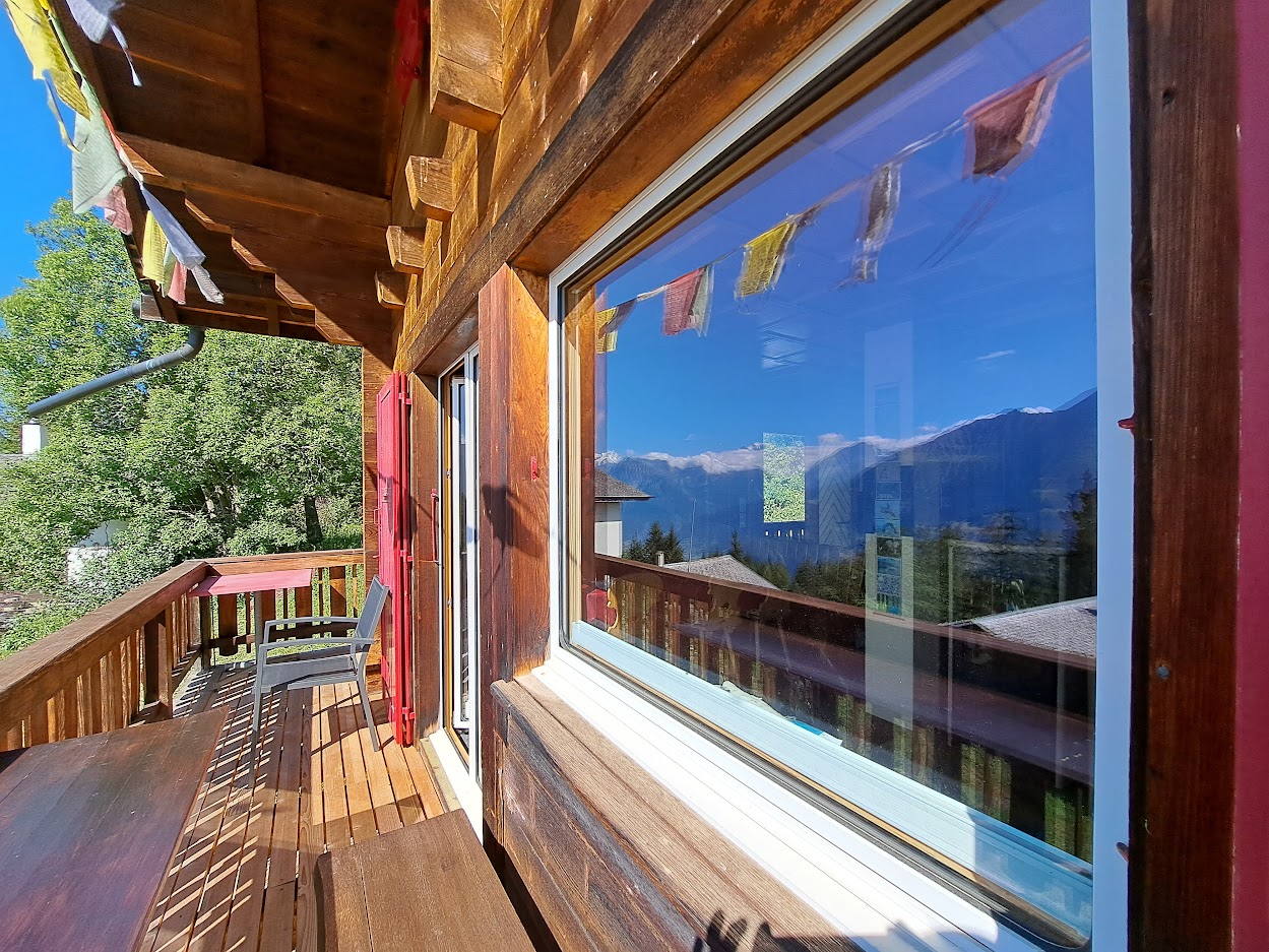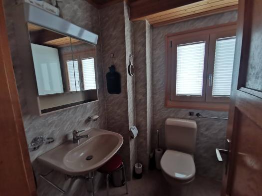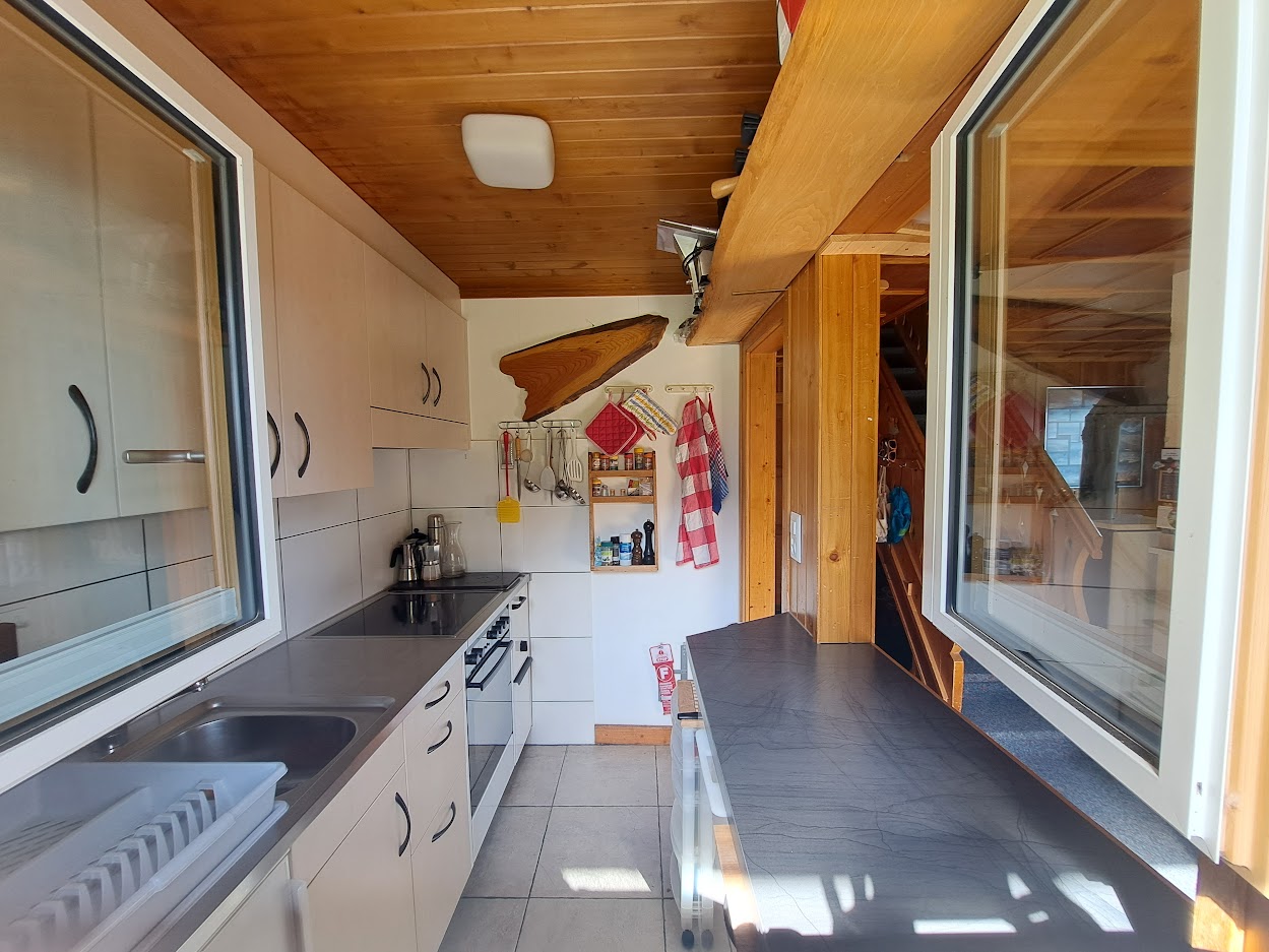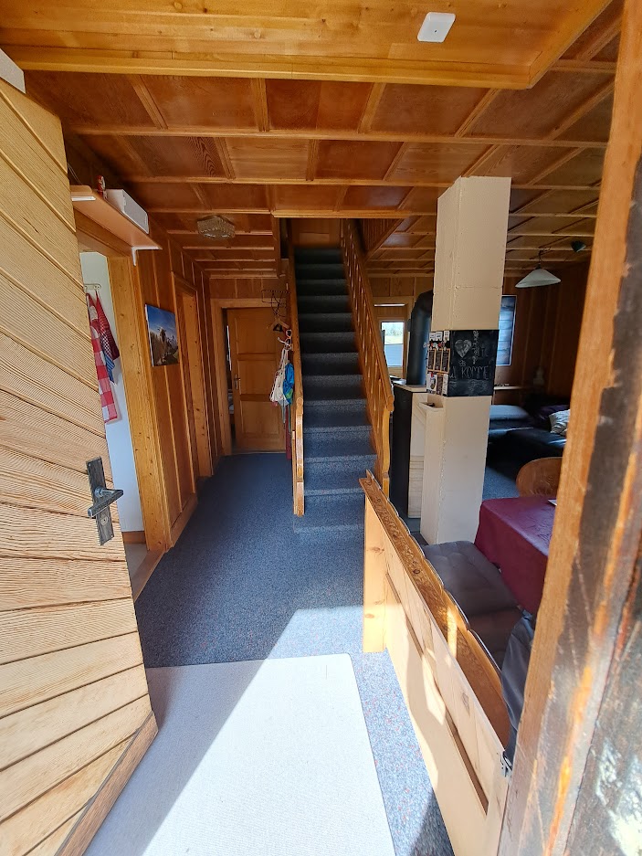 Die obere Duplex-Wohnung besteht aus 3 Schlafzimmern mit je 2 Betten, sowie ein Schlafsofa im Wohnzimmer. Die Küche ist komplett ausgestattet für 8 Personen (Fondue, Raclettofen, Backofen, Mixer etc.). Es gibt ein Badezimmer mit Dusche im unteren Stock sowie eine Toilette im oberen Stock. Im offenen, gemütlichen Wohn-/Essbereich steht ein grosser Tisch, ein schöner Holzofen, ebenso ein Sofa und ein Fernseher. Wlan ist im ganzen Chalet vorhanden. Vom Wohnbereich führt eine Glastür direkt auf den Balkon mit Sitzgelegenheit. Der Balkon bietet ein wunderbarer Ausblick auf die Berge. Zum Chalet gehört ein Holzschopf, wo Skis, Snowboards, Schlitten, Schneeschuhe, Langlaufskis, Fahrräder etc. untergebracht werden können. Über die Aussentreppe gelangt man zum Stau- und Trocknungsraum für die Skischuhe.