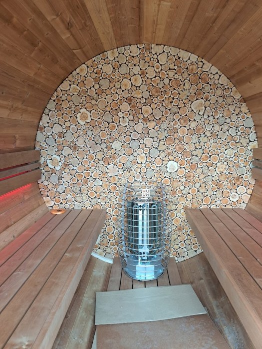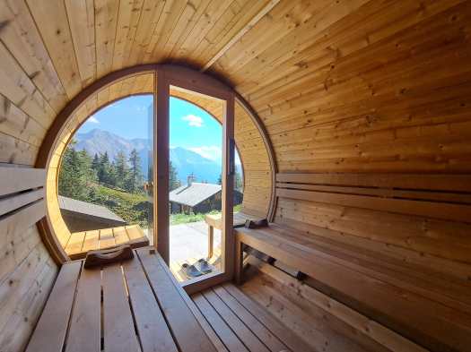 Die exklusive Fass-Sauna mit Wacholderwand und Panoramafenster erwartet Dich nach dem Skifahren oder Wandern.